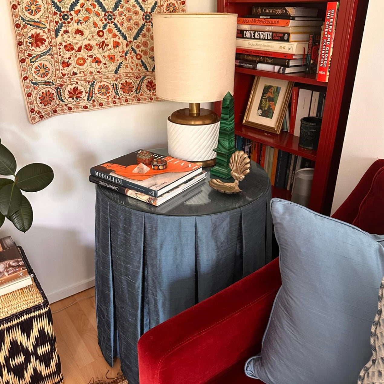 Made-to-measure pleated tablecloth and self-piped cushion.