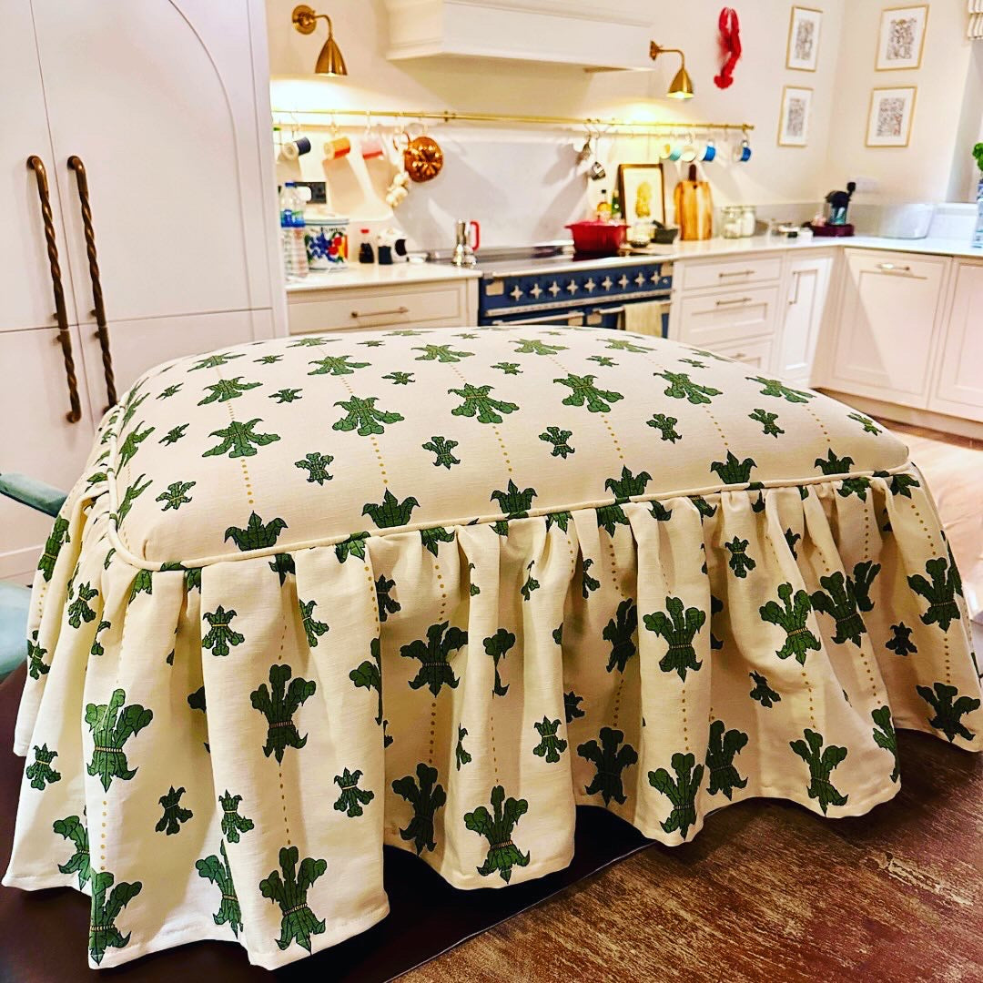 Re-upholstered footstool with skirt.